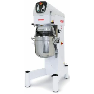 Миксер планетарный напольный с электромеханической панелью управления с 3 скоростями и таймером, с ручным подъёмом дежи, имеет все движущиеся части из никель-хромомолибденовой стали.