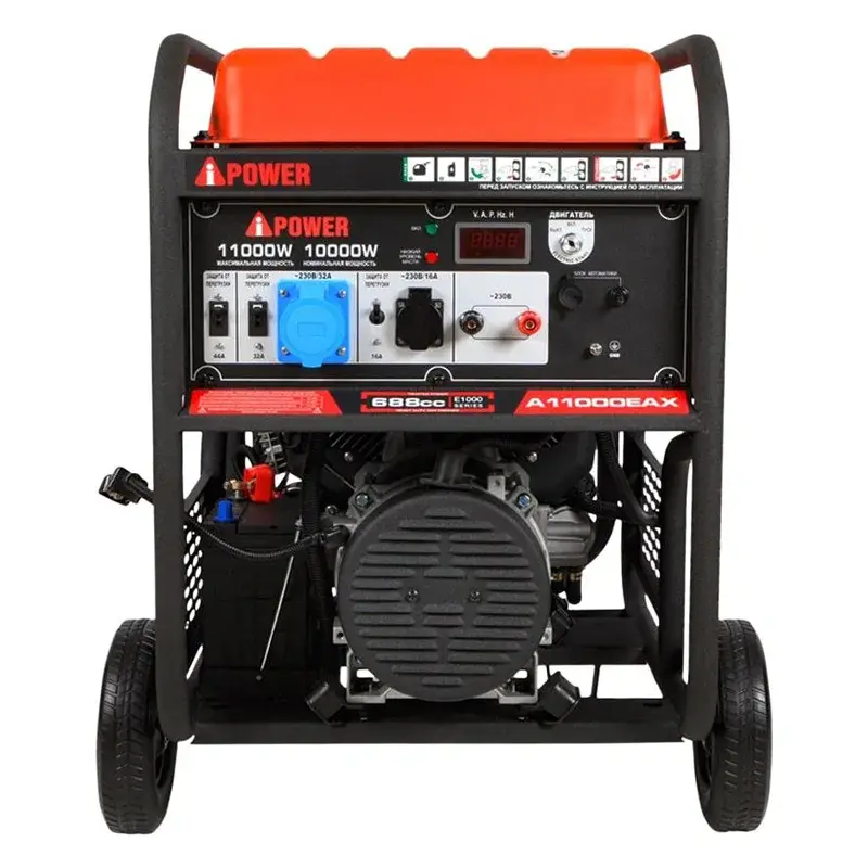 Бензиновый генератор A-iPower A11000EAX предназначен для автономного электроснабжения потребителей однофазного тока. Номинальная мощность составляет 10 кВт. Устройство оснащено электростартером и разъемом для подключения блока автоматического ввода резерва — АВР. Отличительная черта этой модели — способность выдерживать кратковременную индуктивную нагрузку до 20 кВА, что позволяет подключать электрооборудование с высоким пусковым током. Топливный бак объемом 45 л обеспечивает около 8 часов непрерывной работы при 100%-ной нагрузке.
