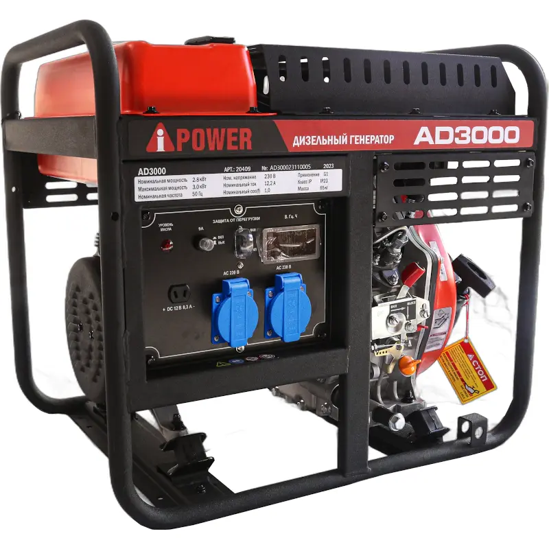 Дизельный генератор A-iPower AD3000 пригодится в качестве автономного источника однофазного тока в частном доме, гараже, мастерской или на строительной площадке при отключении или отсутствии электроэнергии. К портативной электростанции можно подключать электрооборудование, потребляющее до 2,8 кВт. Четырехтактный двигатель с воздушным охлаждением мощностью 5,5 л.с. запускается с помощью ручного стартера. При необходимости можно приобрести транспортировочный комплект, состоящий из ручки и колес.