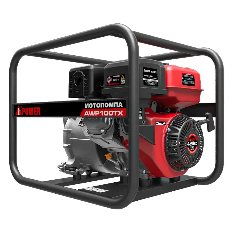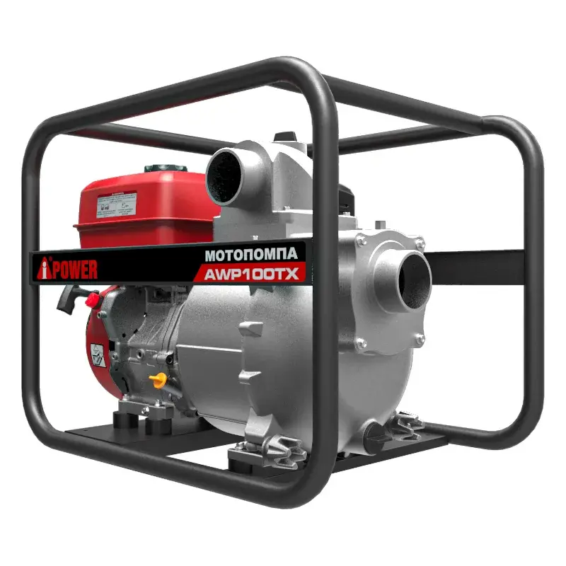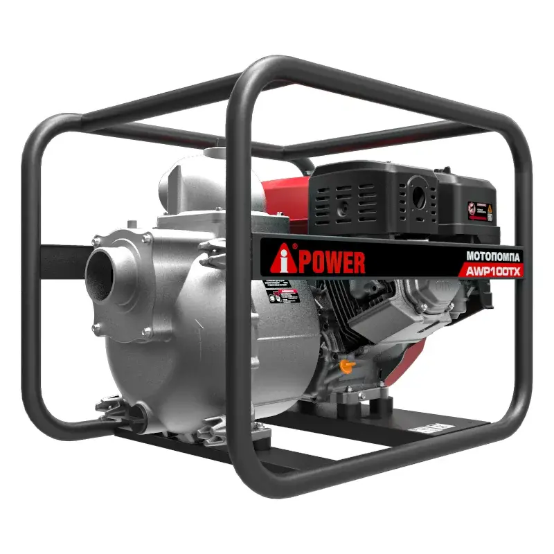 Бензиновая мотопомпа A-iPower с 4-тактным двигателем внутреннего сгорания мощностью 15 л.с. забирает воду с глубины до 8 м и обеспечивает ее подъем на высоту 32 м. Диаметр заливного и выпускного отверстий составляет 100 мм и способствует большой пропускной способности мотонасоса A-iPower AWP100TX.