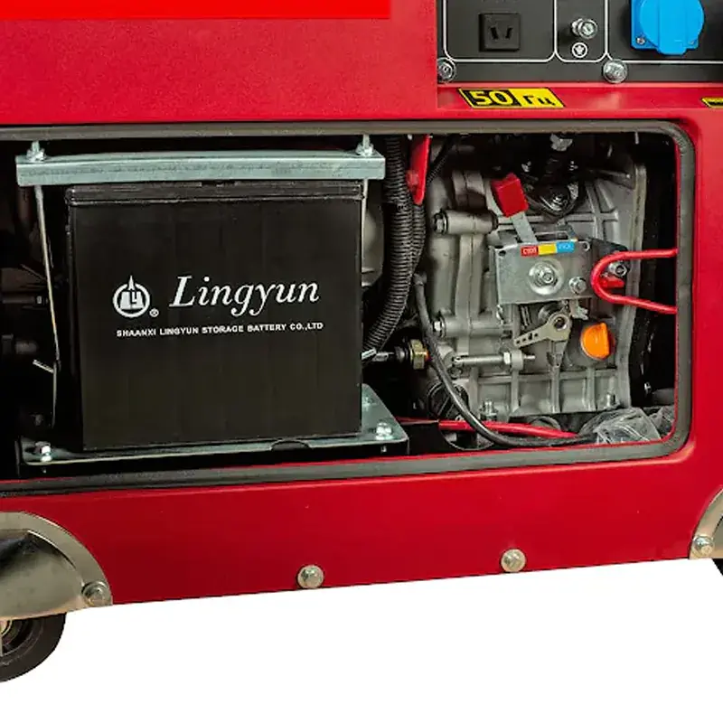 Благодаря электростартеру двигатель быстро запускается поворотом ключа в замке зажигания. Вместительный топливный бак на 14,5 литров обеспечивает продолжительную работу дизельного генератора без дозаправки. Количество топлива удобно отслеживать благодаря индикатору на крышке. На цифровом дисплее отображаются текущие данные о напряжении, частоте тока и количестве моточасов. Индикаторная лампа сигнализирует о низком уровне моторного масла. На панели находятся две розетки переменного тока 230 В на 16/32 А и выход постоянного тока 12 В для подключения потребителей. Разъем АВР позволяет подключить оборудование, которое автоматически запускает генератор при отключении центрального электроснабжения.