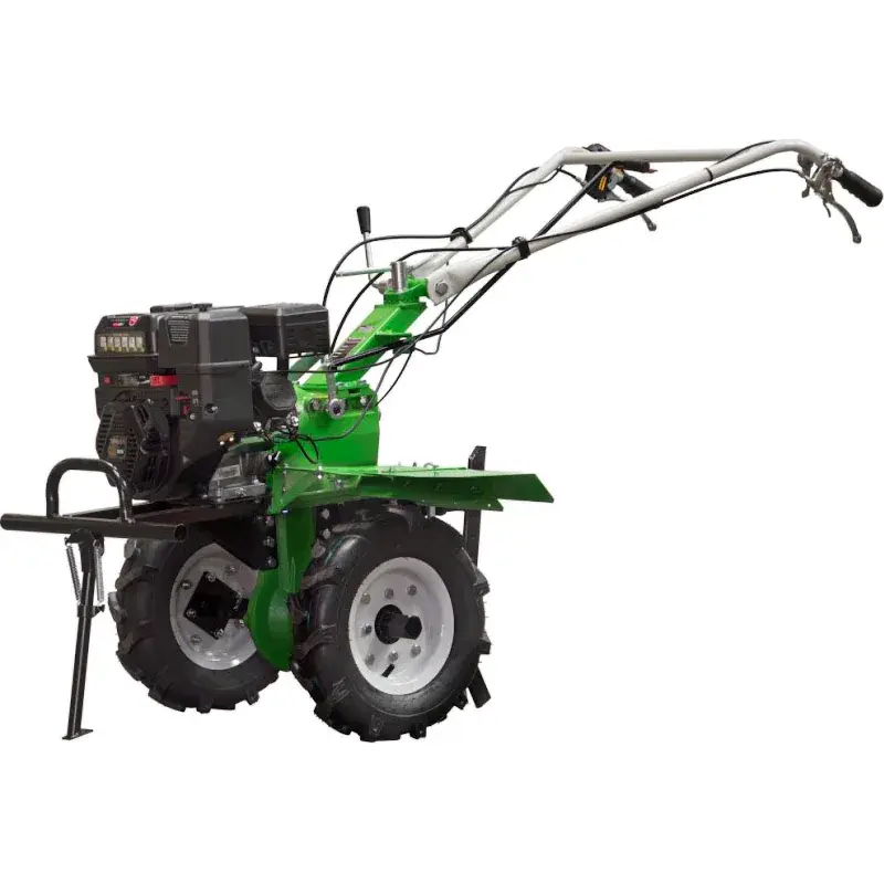 Бензиновый мотоблок оснащен одноцилиндровым четырехтактным двигателем с ручным стартером. Чугунный корпус редуктора надежен даже при вспашке тяжелого грунта. Бензобак объемом 3,6 л рассчитан на продолжительную работу без дозаправки. Вы можете выбрать ширину обработки: 800 или 1050 мм, устанавливая разное количество фрез. Максимальная глубина вспашки — 300 мм.