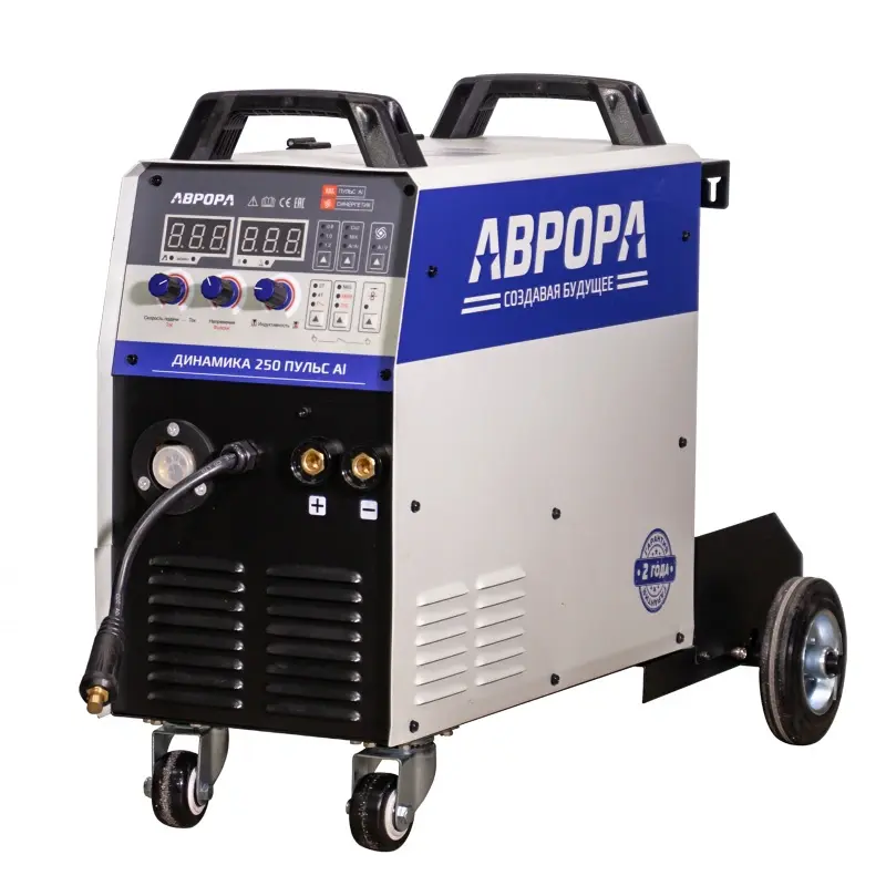 Для работы используются электроды диаметром от 1,6 до 5 мм или проволока от 0,6 до 1,2 мм. Аппарат совместим как с катушками D200, так и D300. Модель идеально подходит для автосервиса, мастерской или небольшого производства. Благодаря току длительной нагрузки 180 А при температуре +40 °C сварочный аппарат Aurora Динамика 250 ПУЛЬС Al отличается высокой производительностью и не перегревается при долгом использовании без перерывов. Помимо настройки основных параметров, вы можете самостоятельно регулировать стартовый ток, пред- и постгаз, а также задавать длительность и ток заварки кратера.