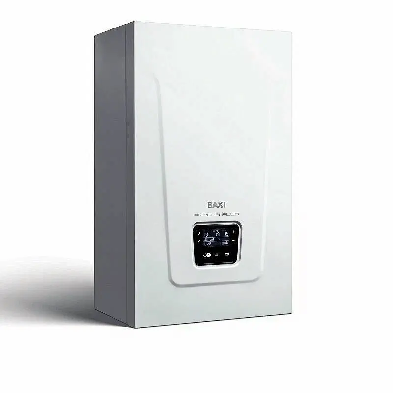 Электрический котел Baxi Ampera Plus 14 с одним контуром и ступенчатым переключением мощности служит для отопления помещений и, в случае подключения бойлера, для горячего водоснабжения. Встроенный термостат с часами реального времени работает согласно запрограммированным режимам. Датчик температуры окружающего воздуха обеспечивает автоматическую регулировку степени нагрева в зависимости от изменения погодных условий. Аппарат работает от трехфазной сети и поддерживает шесть ступеней тепловой мощности: 2,5; 5; 7,5; 10; 12,5 и 14 кВт. Объем теплоносителя в контуре циркуляции составляет 5 л.