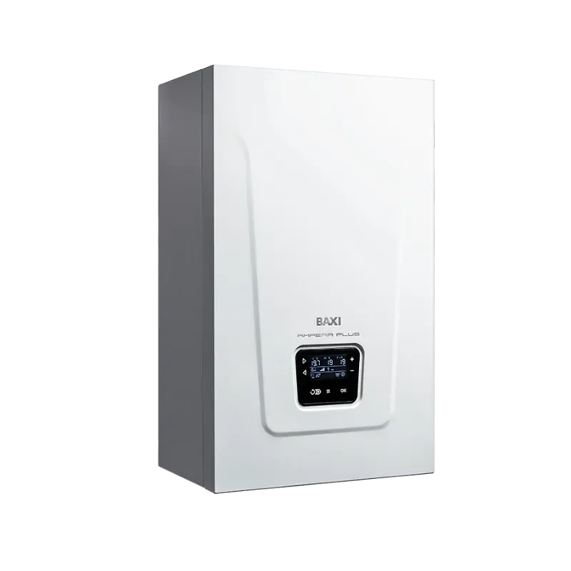 Электрический котел Baxi Ampera Plus 18 с одним контуром и ступенчатым переключением мощности служит для отопления помещений и, в случае подключения бойлера, для горячего водоснабжения. Встроенный термостат с часами реального времени работает согласно запрограммированным режимам. Датчик температуры окружающего воздуха обеспечивает автоматическую регулировку степени нагрева в зависимости от изменения погодных условий. Аппарат работает от трехфазной сети и поддерживает шесть ступеней тепловой мощности: 3, 6, 9, 12, 15 и 18 кВт. Объем теплоносителя в контуре циркуляции составляет 5 л.