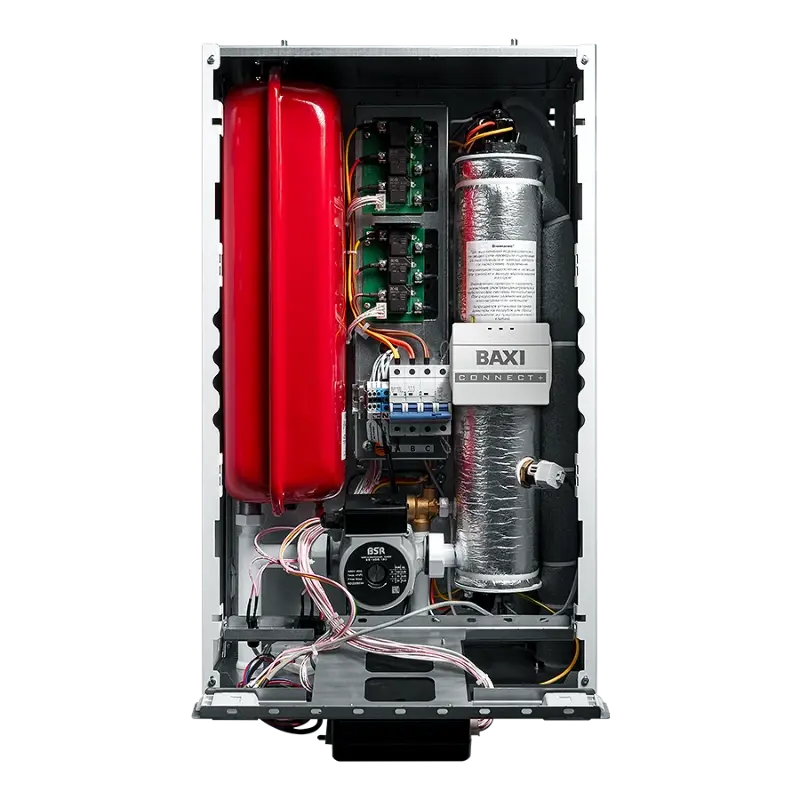 На дисплее с подсветкой отображаются рабочие параметры, такие как ступень мощности, температура теплоносителя, код ошибки и прочие. Котел функционирует по графику, указанному в настройках. Благодаря возможности установки трехходового клапана к электрическому котлу BAXI можно подключить бойлер для организации горячего водоснабжения. В этом случае становится доступной функция «антилегионелла». Она предназначена для периодического нагрева воды в контуре ГВС до высокой температуры с целью уничтожения болезнетворных бактерий и обеззараживания бака.