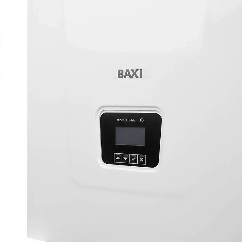 Электрический котел Baxi Ampera Plus 9 с одним контуром и ступенчатым переключением мощности служит для отопления помещений и, в случае подключения бойлера, для горячего водоснабжения. Встроенный термостат с часами реального времени работает согласно запрограммированным режимам. Датчик температуры окружающего воздуха обеспечивает автоматическую регулировку степени нагрева в зависимости от изменения погодных условий. Аппарат работает от одно- или трехфазной сети и поддерживает шесть ступеней тепловой мощности: 1,5; 3; 4,5; 6; 7,5 и 9 кВт. Объем теплоносителя в контуре циркуляции составляет 5 л.
