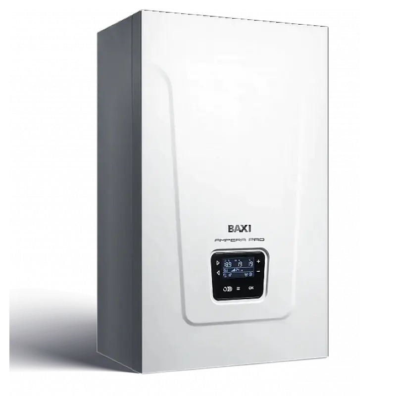 Электрический котел Baxi Ampera Pro 12 с одним контуром и ступенчатым переключением мощности служит для отопления помещений и, в случае подключения бойлера, для горячего водоснабжения. Встроенный термостат с часами реального времени работает согласно запрограммированным режимам. Датчик температуры окружающего воздуха обеспечивает автоматическую регулировку степени нагрева в зависимости от изменения погодных условий. Аппарат работает от трехфазной сети и поддерживает шесть ступеней тепловой мощности: 2, 4, 6, 8, 10 и 12 кВт. Объем теплоносителя в контуре циркуляции составляет 5 л.