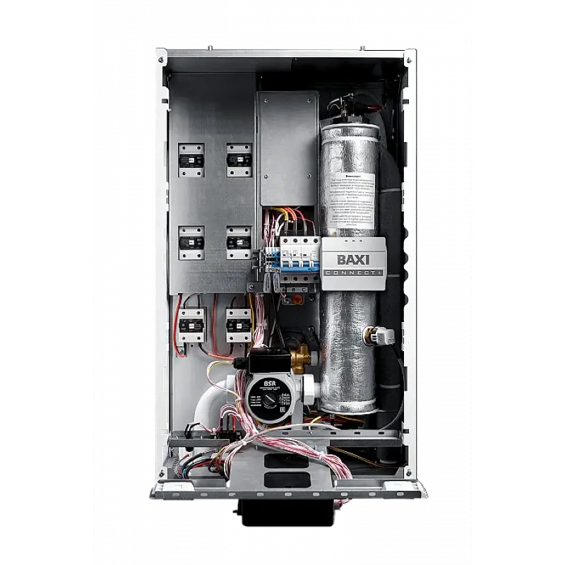 На дисплее с подсветкой отображаются рабочие параметры, такие как ступень мощности, температура теплоносителя, код ошибки и прочие. Котел функционирует по графику, указанному в настройках. Благодаря возможности установки трехходового клапана к электрическому котлу BAXI можно подключить бойлер для организации горячего водоснабжения. В этом случае становится доступной функция «антилегионелла». Она предназначена для периодического нагрева воды в контуре ГВС до высокой температуры с целью уничтожения болезнетворных бактерий и обеззараживания бака.