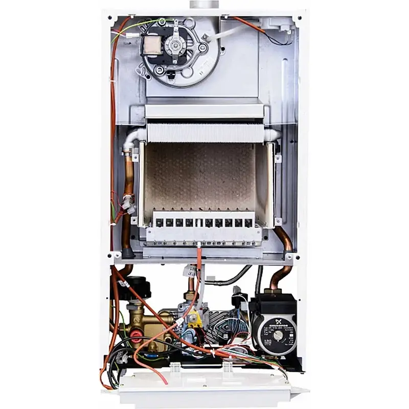 Продукты горения принудительно выводятся через двухтрубный дымоход из закрытой камеры сгорания. При отсутствии воды или недостаточном давлении в системе аппарат автоматически отключается. Датчики тяги, давления и пламени в совокупности с системами защиты от перегрева и замерзания обеспечивают безопасность эксплуатации котла Baxi ECO Nova 14F.
