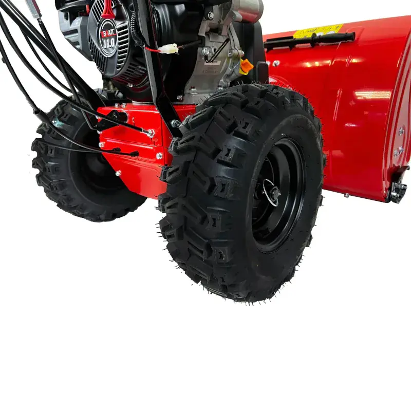 Большие пневматические колеса бензинового снегоуборщика обеспечивают плавный ход. А глубокий рисунок на шинах гарантирует хорошее сцепление как с рыхлым снегом, так и с обледеневшей поверхностью.