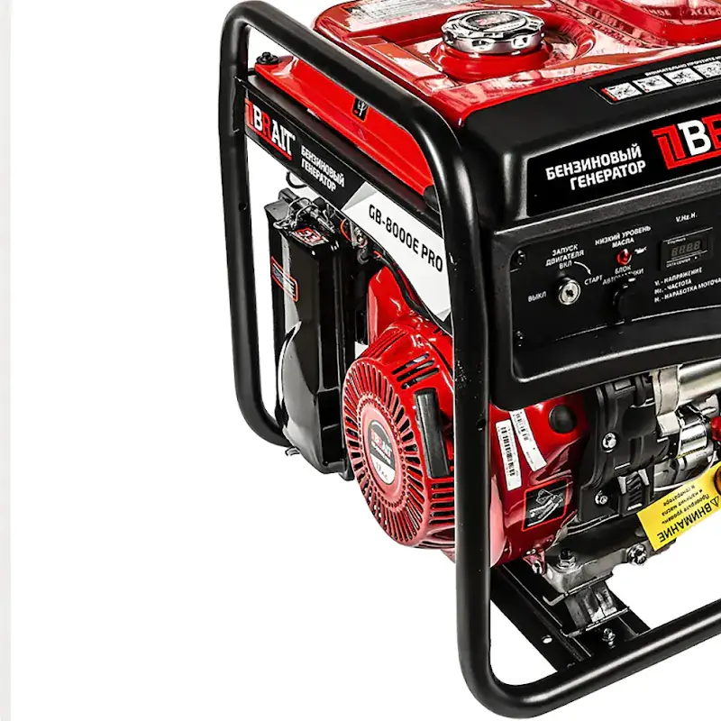 Генератор бензиновый BRAIT GB-8000E PRO оснащен профессиональным одноцилиндровым, 4-тактным, бензиновым двигателем мощностью 17 л.с., с электрозапуском, функцией "легкий старт" и датчиком низкого уровня масла. Минимальный моторесурс 800 м/часов. Запатентованный высококачественноый синхронный альтернатор с защитой от перегрева, изготовленный из горячекатаных кремнестальных листов и обмотками с высоким КПД до 80%.
