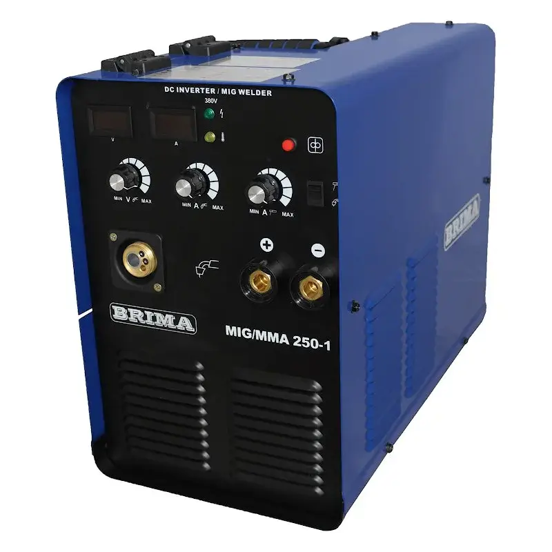 Сварочный полуавтомат BRIMA MIG/MMA-250-1 – промышленный аппарат для работы в режимах MMA и MIG. Максимальный сварочный ток составляет 250 А. Для использования модели подойдет проволока диаметром 0,8 - 1 мм или электрод от 1,6 до 6 мм.