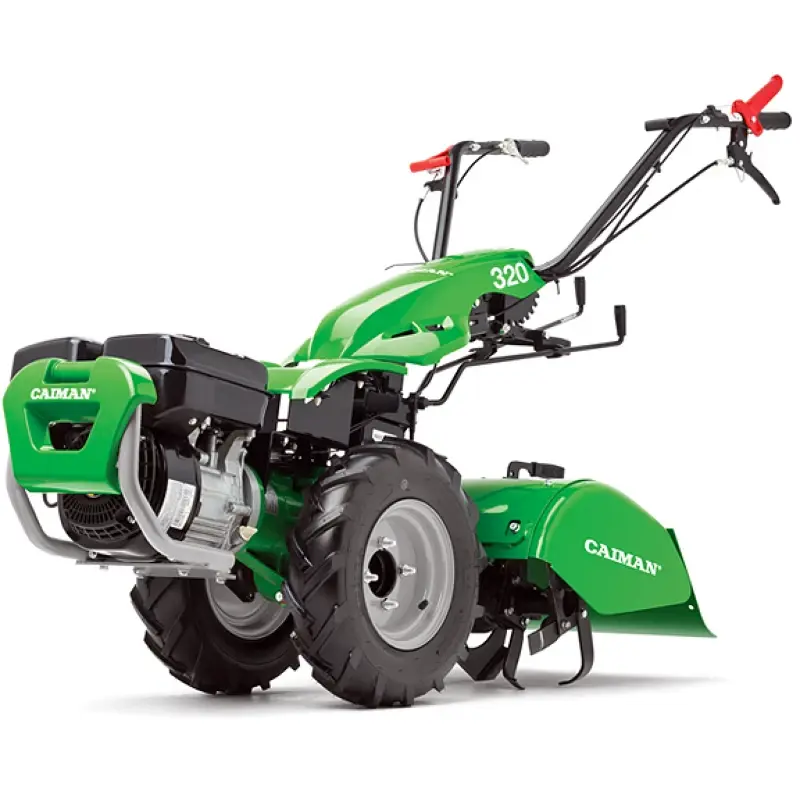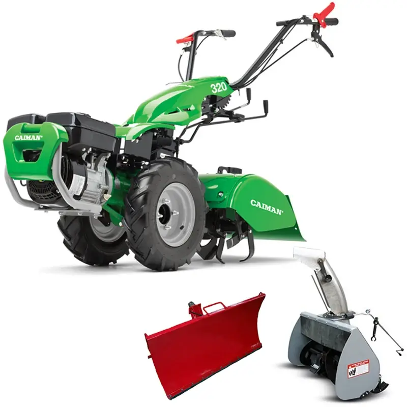 Мотоблок с валом отбора мощности CAIMAN 320 в комплекте с культиваторной фрезой, снежным отвалом и навесным роторным снегоуборщиком - профессиональная модель, которая предназначена для работы в частных владениях и небольших фермерских хозяйствах. Доступно и другое навесное оборудование (приобретается отдельно), при помощи которого решаются задачи вспашки, уборки грязи, стрижки травы, перевозки грузов по территории.
