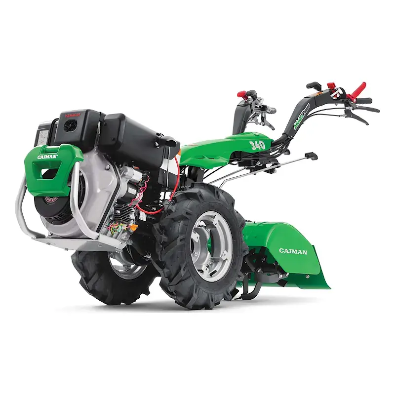 Мотоблок Caiman Atletico 340PD – многофункциональный двухколесный трактор с профессиональным дизельным двигателем Yanmar мощностью 10 л.с., реверсивной рукояткой управления, гидравлическим сцеплением PowerSafe®, блокировкой дифференциала, независимыми рабочими тормозами и шириной обработки почвы до 80 см (в зависимости от выбора навесного приспособления). Эта универсальная машина позволяет круглый год выполнять множество задач наряду с классической культивацией: обработка почвы, уход за садом и газонами, междурядная стрижка в виноградниках и фруктовых садах, работа на неухоженных территориях. Реверсивная рукоятка управления, в сочетании с правильным соотношением передних скоростей и скоростью вращения независимого ВОМ, позволяют использовать мотоблок и с задним, и с передним навесным оборудованием. Благодаря простоте ухода и эксплуатации двухколесный трактор может быть использован любыми пользователями: от частных владельцев до профессионалов (фермерских, тепличных, садовых, коммунальных хозяйств).
