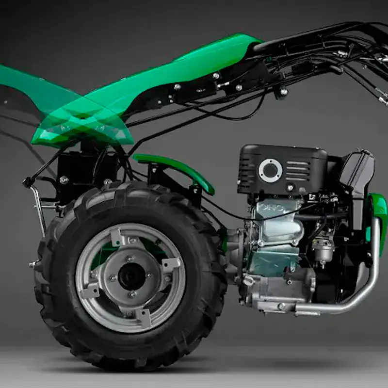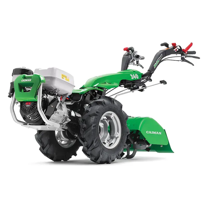 Мотоблок Caiman Atletico 340PT – многофункциональный двухколесный трактор с профессиональным бензиновым двигателем Honda мощностью 11,7 л.с., реверсивной рукояткой управления, гидравлическим сцеплением PowerSafe®, блокировкой дифференциала, независимыми рабочими тормозами и шириной обработки почвы до 80 см (в зависимости от выбора навесного приспособления). Эта универсальная машина позволяет круглый год выполнять множество задач наряду с классической культивацией: обработка почвы, уход за садом и газонами, междурядная стрижка в виноградниках и фруктовых садах, работа на неухоженных территориях. Реверсивная рукоятка управления, в сочетании с правильным соотношением передних скоростей и скоростью вращения независимого ВОМ, позволяют использовать мотоблок и с задним, и с передним навесным оборудованием. Благодаря простоте ухода и эксплуатации двухколесный трактор может быть использован любыми пользователями: от частных владельцев до профессионалов (фермерских, тепличных, садовых, коммунальных хозяйств).