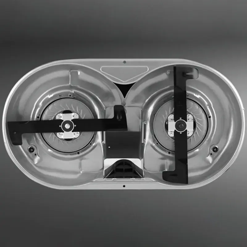 Перпендикулярно установленные ножи с синхронным вращением На газонокосильной деке UniDeck ножи установлены перпендикулярно. Они вращаются синхронно под углом 90° по отношению друг к другу. За счет этого достигается высокая эффективность кошения травы и ее сбора в травосборник. Такая конструкция исключает образование участков нескошенной травы между ножами при маневрировании машины.