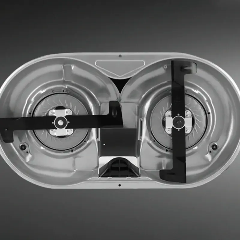 Перпендикулярно установленные ножи с синхронным вращением На газонокосильной деке UniDeck ножи установлены перпендикулярно. Они вращаются синхронно под углом 90° по отношению друг к другу. За счет этого достигается высокая эффективность кошения травы и ее сбора в травосборник. Такая конструкция исключает образование участков нескошенной травы между ножами при маневрировании машины.