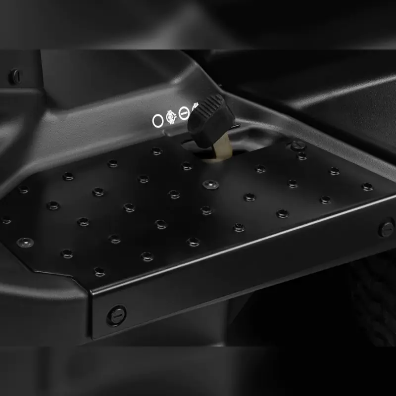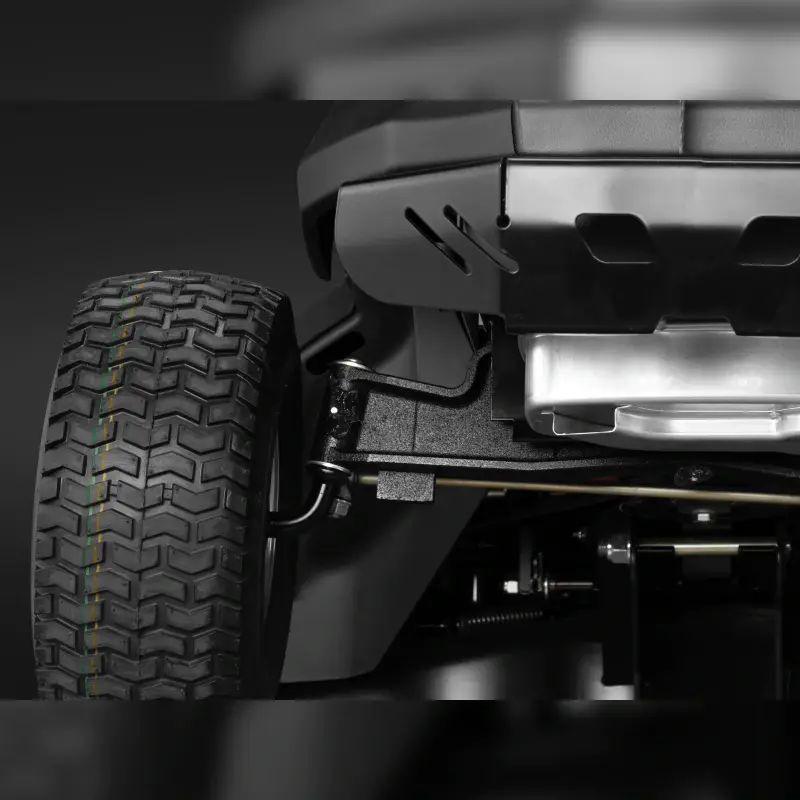 Широкие колеса с дерновыми покрышками Большая площадь касания снижает давление на грунт, а специальный мелкий рисунок протектора снижает риск повреждения деликатного газона.