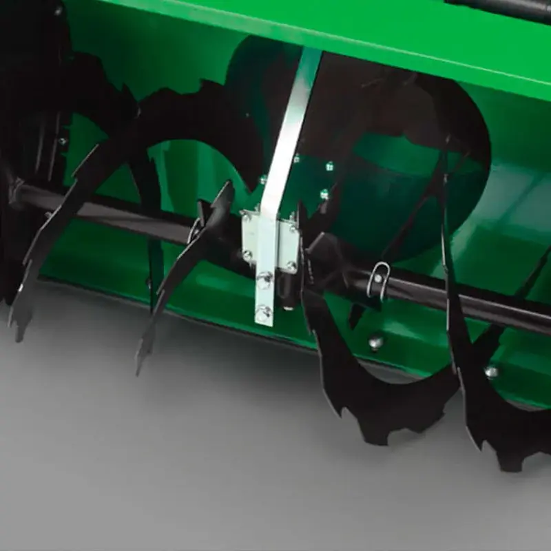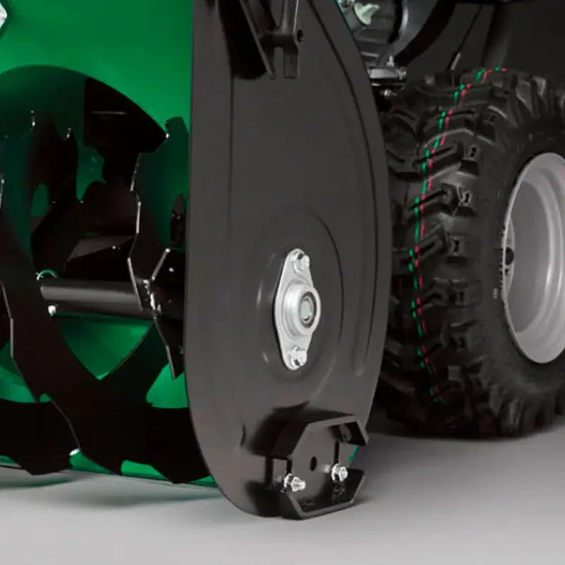 На ковше расположены реверсивные башмаки. Их положение настраивается вручную, чтобы задавать расстояние между кожухом шнека и очищаемой поверхностью. Это позволит настроить снегоуборщик как на глубокое снятие снега, так и предотвратить случайное касание ковша с дорожкой под сугробами.
