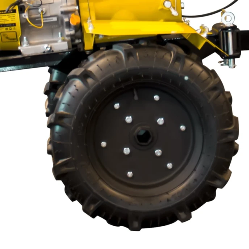Мотоблок Champion ВС 1193 оборудован многодисковым сцеплением с коробкой передач обеспечивающей 2 скорости вперёд либо 1 назад. Все управление вынесено на рукоятки управления. Усиленный шестеренчатый редуктор обеспечивает высокий КПД передачи крутящего момента на фрезы или пневмоколеса. Пневмоколеса входящие в комплект поставки имеют большой диаметр и ширину (5/12 дюймов). Благодаря таким большим колесам, мотоблок обеспечивает высокую устойчивость и скорость передвижения при подсоединении транспортировочной телеги.