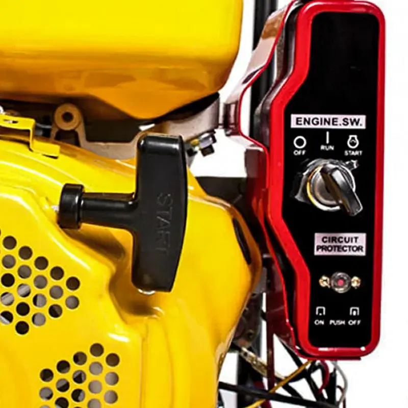 Для быстрого запуска двигателя в мотопомпе есть электростартер. Мотор заводится от поворота ключа зажигания в замке. В отличие от ручного запуска, вам не придется прилагать усилие на пусковом тросе, что значительно упрощает включение двигателя.