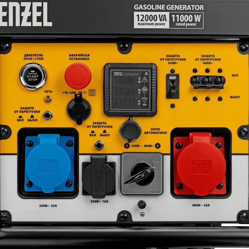 Бензиновый генератор Denzel PS-120EAD-3 946984 максимальной мощностью 12 кВт, с баком объемом 40 л, разъемом ATS, переключателем режима и электрическим стартером, способен поддерживать напряжение в сети 230/400 В. Предназначен для обеспечения питанием приборов и оборудования в случае отсутствия стационарной сети или перебоев в ее работе. Подключение потребителей производится при помощи розетки 230 В/16 А, а также силовой розетки 230 В/32 А и розетки трехфазного тока 400 В/32 А. Разъем USB 5 В позволяет заряжать мобильные устройства.