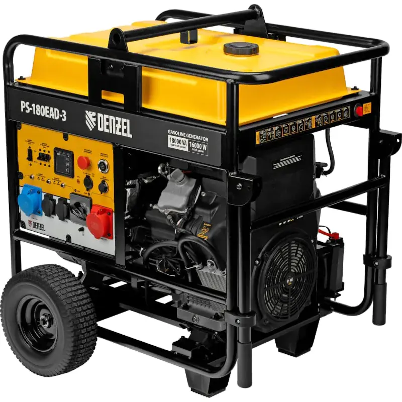 Бензиновый генератор Denzel PS-180EAD-3 946994 максимальной мощностью 18 кВт, с баком объемом 65 л, разъемом ATS, переключателем режима и электрическим стартером, способен поддерживать напряжение в сети 230/400 В. Предназначен для обеспечения питанием приборов и оборудования в случае отсутствия стационарной сети или перебоев в ее работе. Подключение потребителей производится при помощи 2-х розеток 230 В/16 А, а также силовой розетки 230 В/32 А и розетки трехфазного тока 400 В/32 А. Разъем USB 5 В позволяет заряжать мобильные устройства.