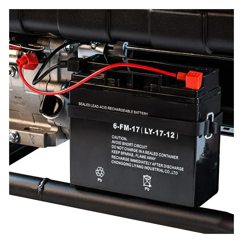 Бензиновый генератор поставляется в комплекте с аккумуляторной батареей для электронного запуска. Старт мотора происходит как в автомобиле - простым поворотом ключа. Если батарея сядет, двигатель всегда можно включить с помощью троса.