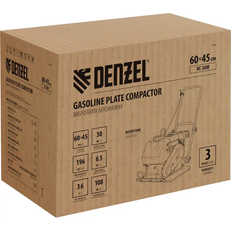 Виброплита бензиновая Denzel VC-30W 97042 с основанием размером 60 х 45 см, оснащена двигателем объемом 196 см3, баком для воды, и воздействует на поверхность с центробежной силой 30 кН. Применяется для уплотнения грунта, асфальта, щебеночного покрытия и других материалов. Ровная рабочая поверхность обеспечивает высокое качество выполняемых работ. Виброплита может использоваться на строительной площадке и при проведении дорожного ремонта.