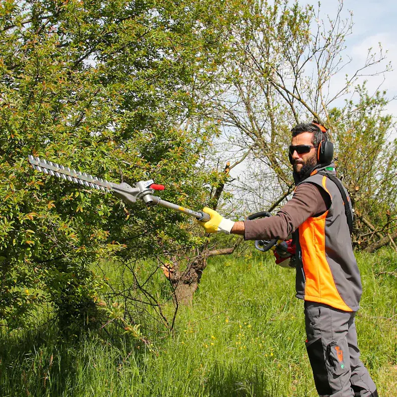 Ножницы для живой изгороди бензиновые EFCO DS 2410HL оснащены телескопической штангой и двойным стальным ножом длиной 500 мм., который фиксируется в 12 положениях на 180 градусов. Общая длина инструмента составляет 2,4 метра.