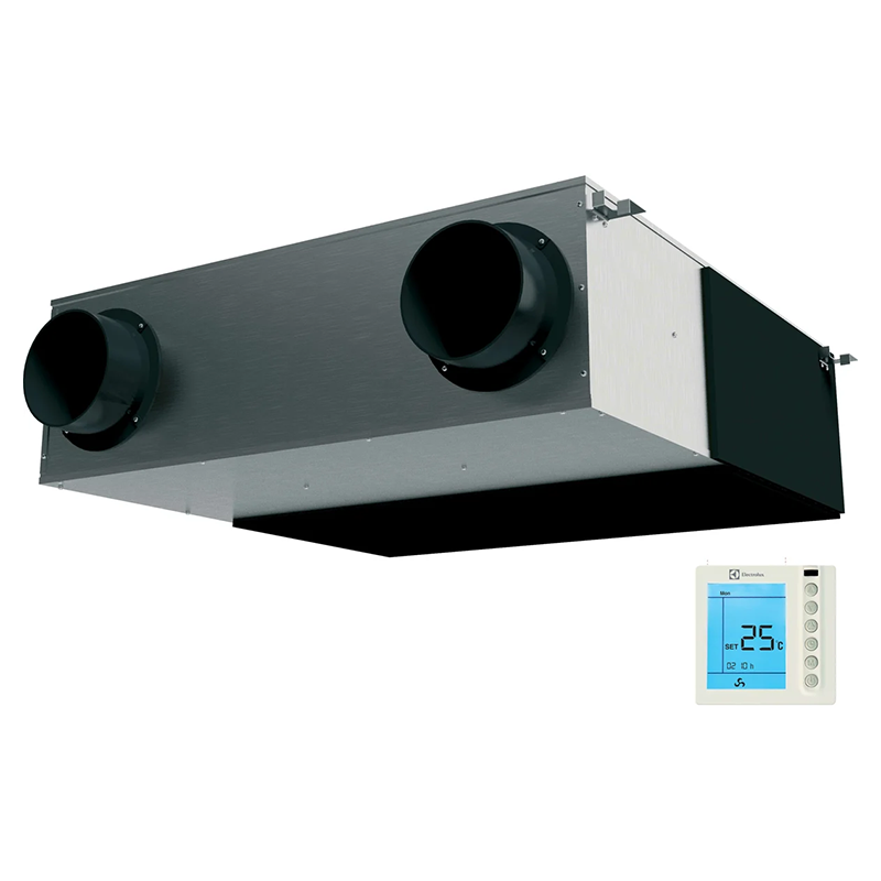 Стандартно установки комплектуются приточным и вытяжным вентиляторами, приточным и вытяжным фильтрами, пластинчатым рекуператором и системой автоматического управления с пультом дистанционного управления. Инновационный тип рекуператора позволяет подогревать и увлажнять приточный воздух, при этом специальная мембрана рекуператора переносит из вытяжного воздуха только молекулы воды, оставляя в нем все загрязнения.
