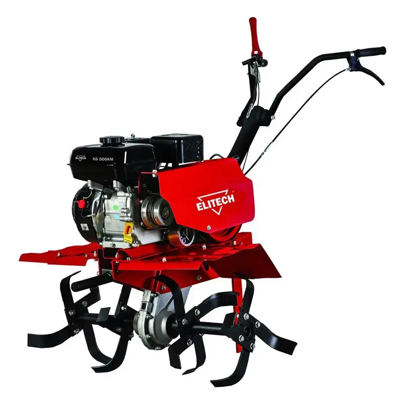 Бензиновый мотоблок ELITECH КБ 506 весит 97 кг и обеспечивает глубину вспашки до 30 см. Поставляется в комплекте с фрезами и большими пневматическими колесами тракторного типа.