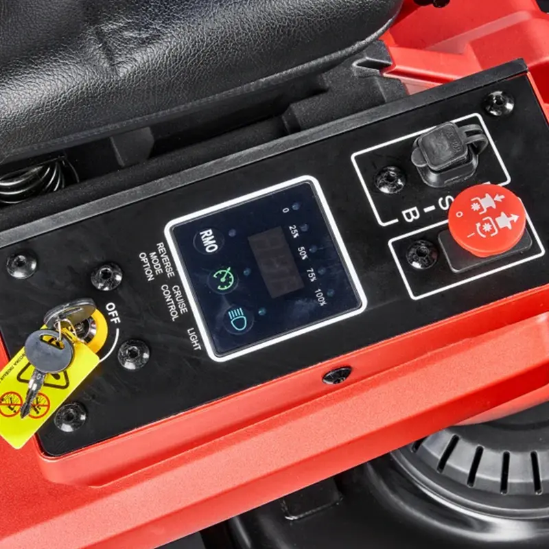 Аккумуляторная газонокосилка с сиденьем оснащена свинцово-кислотным аккумулятором напряжением 48 В и ёмкостью 50 Ач и предназначена для кошения травы на систематически обрабатываемой и предварительно подготовленной поверхности (газон, лужайка, поле для игр и т.п.) с уклоном не более 15 градусов, на участках до 4000 м2, в стандартной комплектации с выбросом скошенной травы вбок, либо кошением травы в режиме мульчирования, когда скошенная трава является удобрением для вновь растущей.