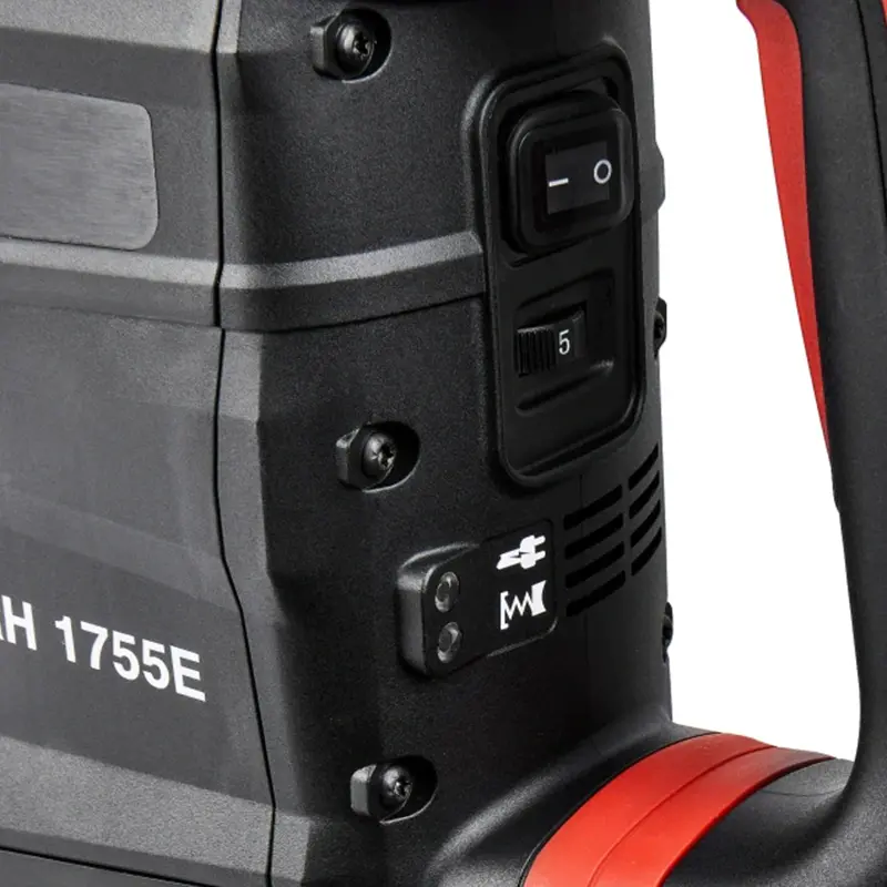 Перфоратор RH 1755Е (E2205.021.01). Тип патрона SDS-max. Мощность 1700 Вт. Количество режимов 2 (сверление с ударом, отбойный молоток). Регулировка положения зубила (12 положений). Регулировка оборотов двигателя. Энергия удара 5-19 Дж. Предназначен для работы с буром, диаметром до 55 мм и коронкой, диаметром до 150 мм. Вертикальное расположение двигателя. Антивибрационная система. Индикатор износа щеток двигателя. Индикатор включения в сеть.