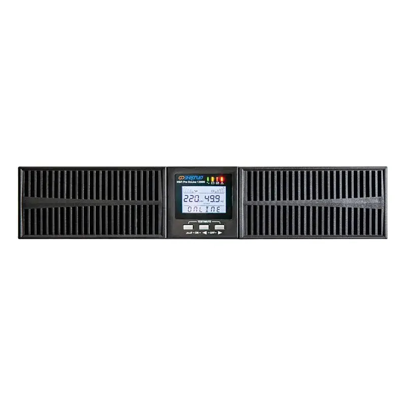 - LCD дисплей с кнопочным управлением. Индикация режима работы ИБП, входного/выходного напряжения, частоты, мощность нагрузки, температуры, заряд батарей, данные об ошибках и неисправности;