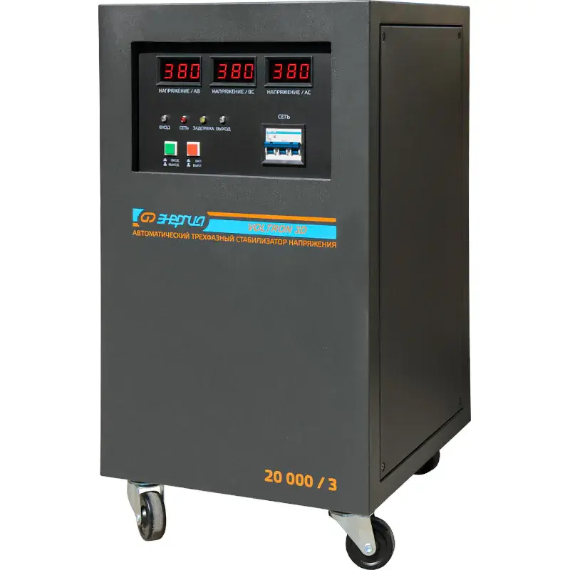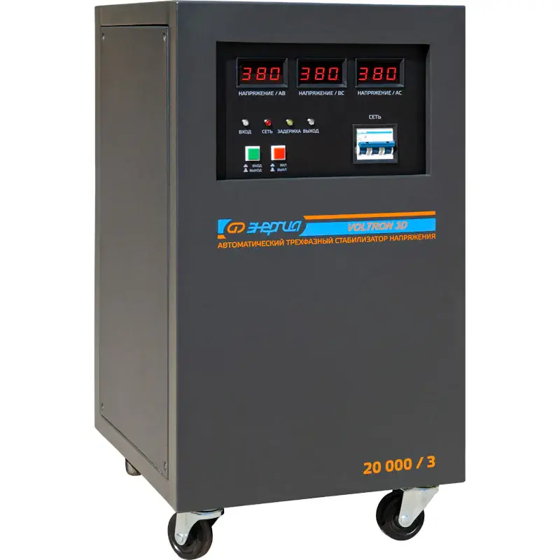 Трехфазный стабилизатор напряжения ЭНЕРГИЯ Voltron 3D 20000/3 обеспечивает подключенное оборудование качественной электрической энергией со стабильными уровнями фазного и линейного напряжения. Максимальная полная мощность нагрузки в длительном режиме составляет 20000 ВА. Благодаря электронной системе управления КПД устройства достигает 98 %. Допускается эксплуатация в температурном диапазоне от -5 до +40_С.