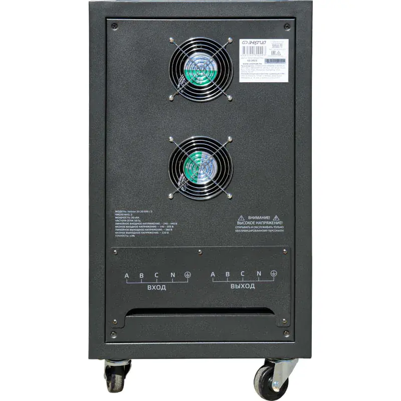 Стабилизатор напряжения ЭНЕРГИЯ Voltron 3D 20000/3 оборудован автоматическими выключателями, срабатывающими в случае короткого замыкания, перекоса фазы, пониженного напряжения или подключения нагрузки, превышающей рекомендованную. При нагревании до 65_С включается вентилятор для принудительного охлаждения.