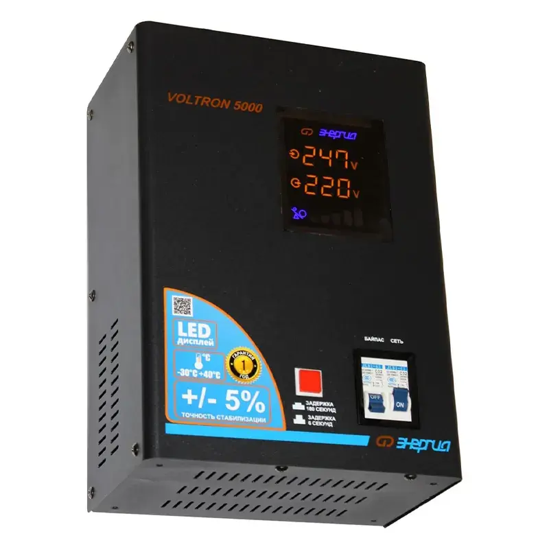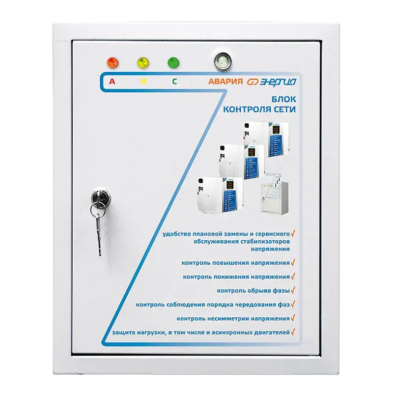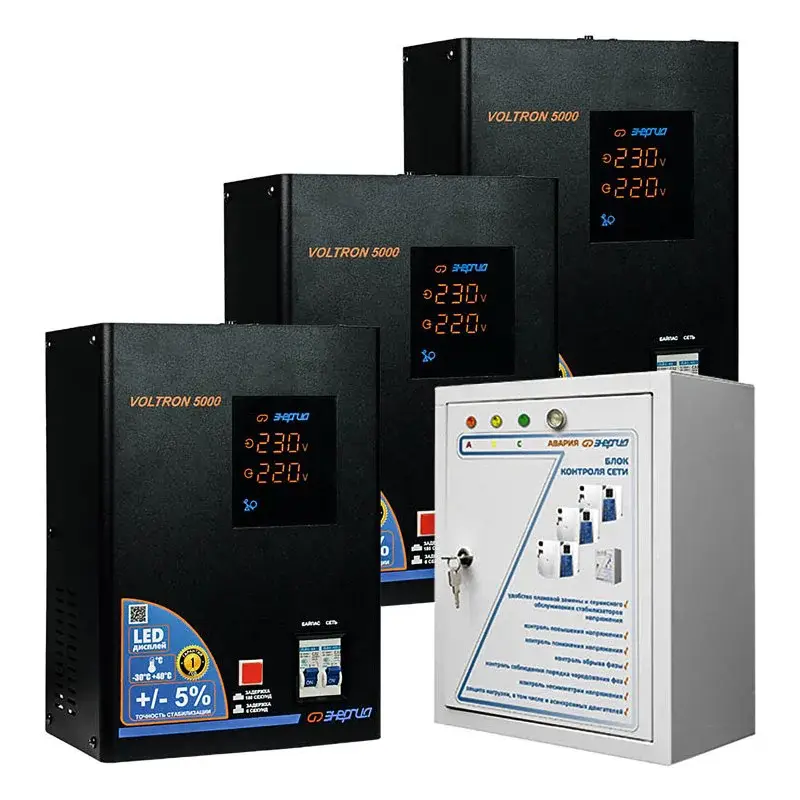 Комплект релейных стабилизаторов напряжения Энергия Voltron (5%) предназначены для обеспечения стабилизированным питанием трехфазных потребителей.