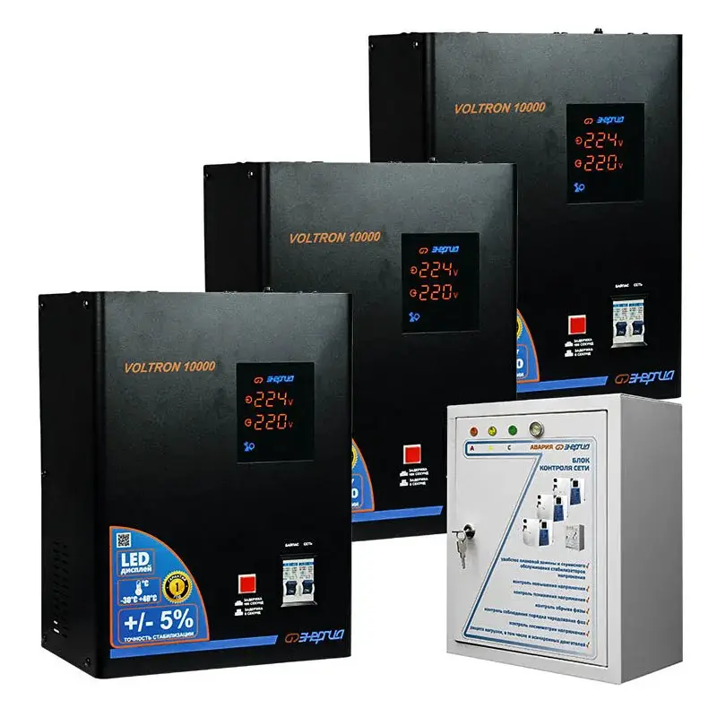 Комплект релейных стабилизаторов напряжения Энергия Voltron (5%) предназначены для обеспечения стабилизированным питанием трехфазных потребителей.