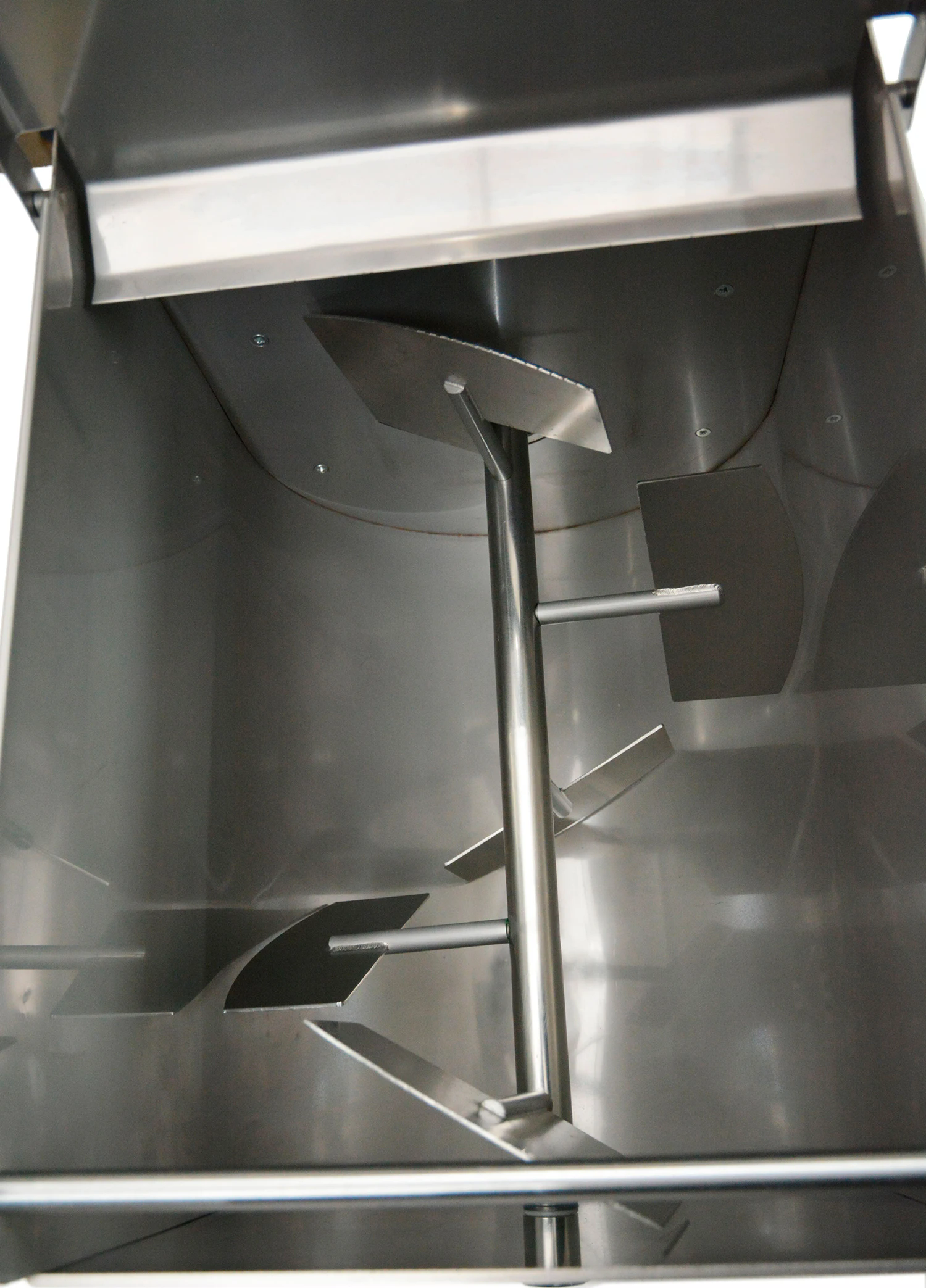 Для загрузки фарша необходимо открыть крышку с отверстиями-дозаторами, затем открыть крышку разгрузочного отверстия, установить ворошитель. Закрыть крышку разгрузочного отверстия. Ингредиенты для перемешивания загрузить в бункер. Закрыть крышку с отверстиями-дозаторами. Выбрать направление вращения ворошителя нажатием кнопки «Пуск» или «Реверс». Перемешивать ингредиенты до получения необходимой консистенции. В процессе перемешивания продукта через отверстия-дозаторы на крышке можно добавлять дополнительные ингредиенты.