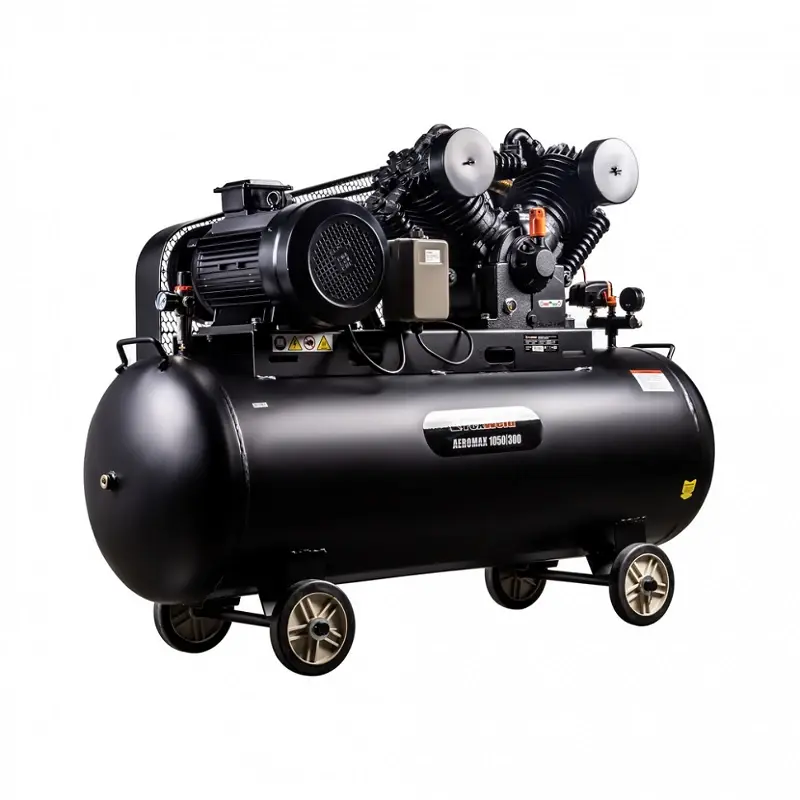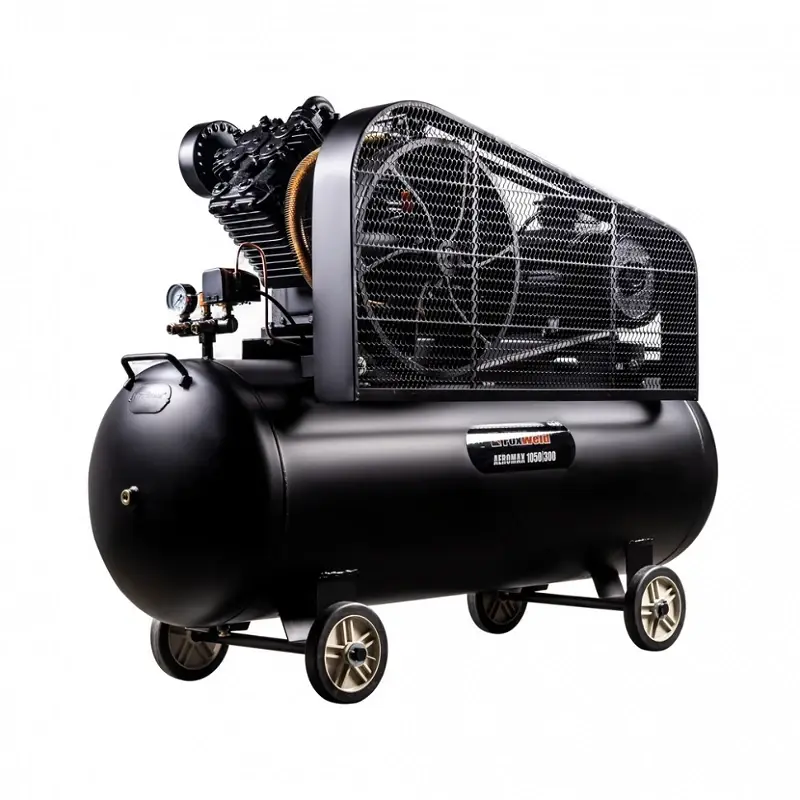 Масляный компрессор профессионального класса работает от электросети напряжением 380 В. Трехфазный двигатель мощностью 7,5 кВт приводит в действие четырехцилиндровую двухступенчатую поршневую группу. Ременная передача поддерживает высокий КПД при сравнительно низких оборотах, улучшает тепловой и нагрузочный режимы двигателя. Передаточное колесо в форме крыльчатки способствует эффективному охлаждению поршневой группы. Оребрение головок цилиндров и воздухопровода улучшает теплоотдачу.