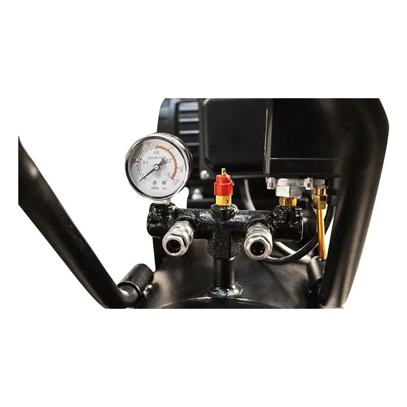 Прессостат автоматически поддерживает давление на уровне 6-8 бар. Объем ресивера 150 л позволяет сократить частоту запусков двигателя. Для точной настройки подаваемого в пневмолинию давления предусмотрены регулятор и два манометра. Вы можете подсоединять пневмоинструмент напрямую к ресиверу компрессора FoxWeld AEROMAX 700/150 для снижения потерь давления.