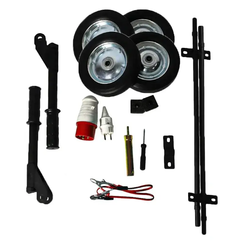 Оборудован электрозапуском (запуском с ключа). Укомплектован колёсами и интегрированными складными ручками для перемещения к месту работы.