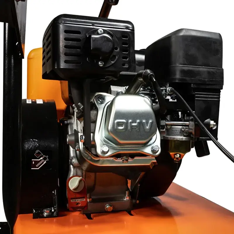 Бензиновая виброплита оснащена мощным четырехтактным двигателем внутреннего сгорания объемом 196 см3. При критическом понижении масла в картере встроенный датчик останавливает работу двигателя для предотвращения поломки. Топливный бак вмещает 3,6 л бензина АИ-92. Максимальный расход топлива составляет 1,2 л/ч.