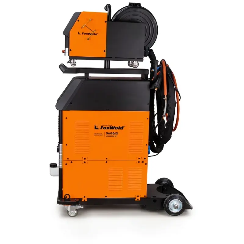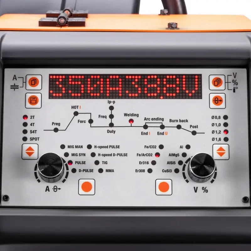 Сварочный полуавтомат SAGGIO MIG 350 HS DP – это многофункциональный промышленный аппарат с полностью цифровым управлением, позволяют производить сварку изделий из низкоуглеродистой и нержавеющей стали, а также алюминиевых и медных сплавов. Аппарат позволяет проводить следующие процессы сварки: полуавтоматическая сварка - ручной режим настройки параметров сварки (MIG MAN), синергетический режим (MIG SYN), синергетический импульсный режим сварки (Pulse), синергетический режим сварки с двойным импульсом (Double Pulse), синергетический импульсный режим сварки (H-speed Pulse), синергетический режим с двойным импульсом (H-speed Double Pulse); аргонодуговая сварка на постоянном токе с возбуждением дуги касанием вольфрамового электрода (TIG); ручная дуговая сварка на постоянном токе штучным электродом (ММА). Режимы «Н-Speed Pulse» и «Н-Speed Double Pulse» позволяют увеличить производительность процесса сварки по сравнению со стандартными программами импульсных процессов. Данная модель позволяет сохранять настройки установленных параметров сварки и воспроизводить их при необходимости. Карта памяти рассчитана на 20 ячеек. SAGGIO MIG 350 HS DP оборудован тележкой на колёсах с местом для установки баллона с газом.