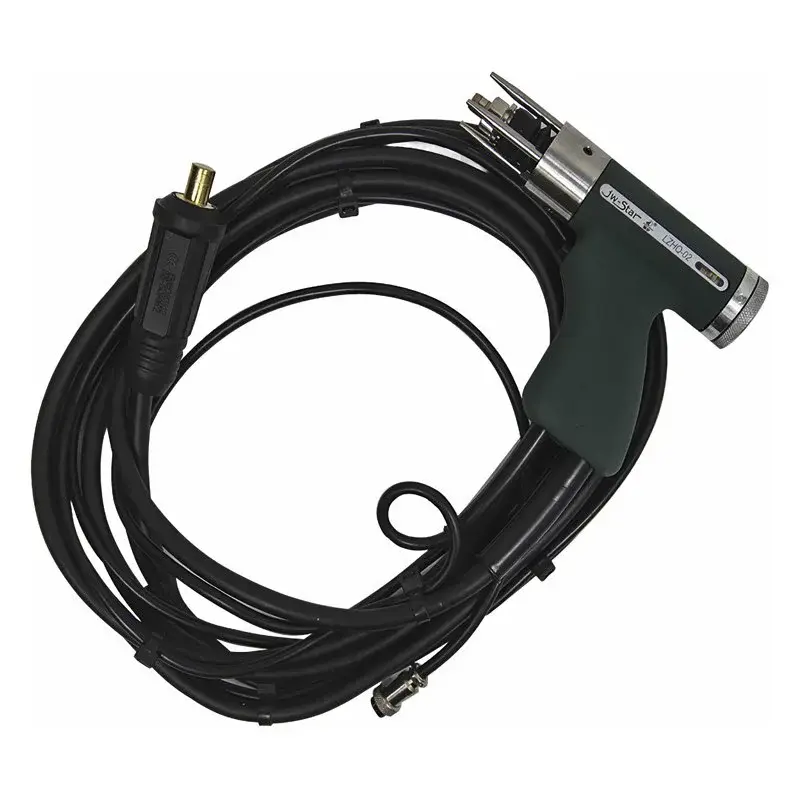 Корпус сварочного пистолета изготовлен из прочного пластика. Опорные ножки в передней части позволяют прижимать крепеж строго перпендикулярно к заготовке. Величину подъема и усилие пружины можно отрегулировать с помощью маховика и шкалы в торце пистолета. Кабели подведены через рукоятку и не мешают работе.