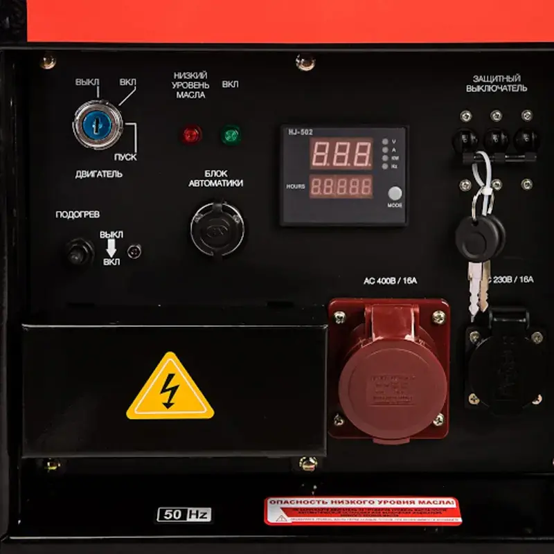 Все основные параметры: количество моточасов, уровень масла, напряжение и частоту, можно контролировать с помощью дисплея.Для простого запуска предусмотрен электростартер.