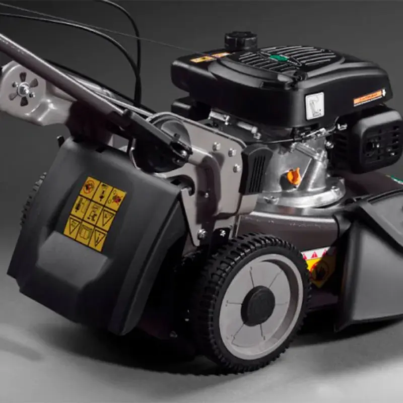 Корпус выполнен из цельнолистового металла, защищенного молотковым покрытием. Данное свойство позволяет сохранить поверхность от сколов и царапин и уменьшает вредное воздействие влажности. За вашу безопасность отвечает стальная защитная рама бензиновой газонной косилки Caiman FERRO 47CV.