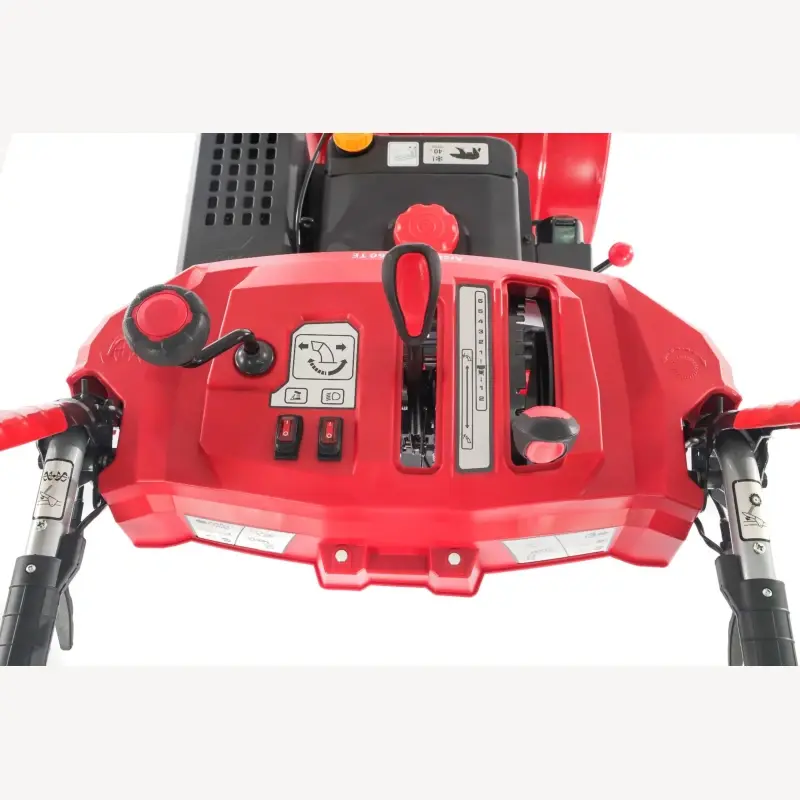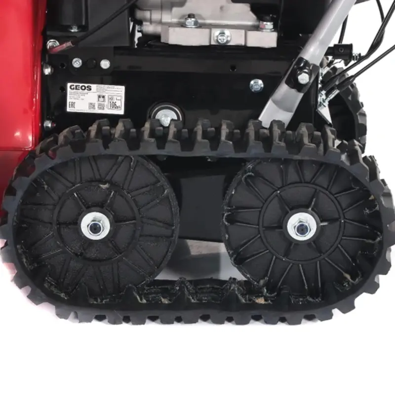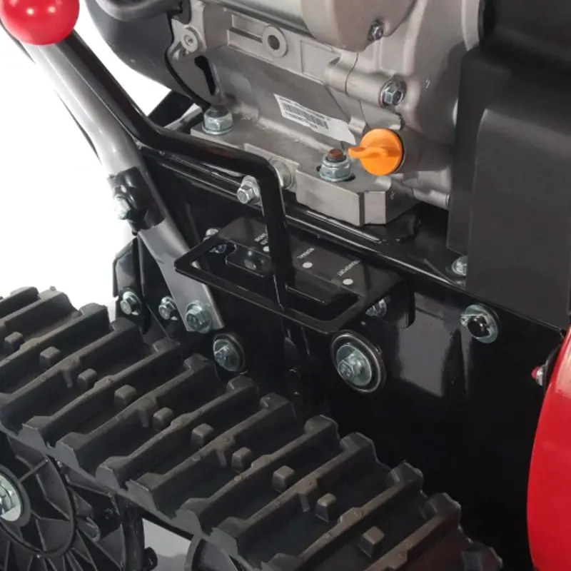 Все управление снегоуборочной машиной вынесено на панель оператора - направление и дальность выброса, включение и отключение подогрева рукояток, все находиться "под рукой". Особенность этого снегоуборщика- это гусеницы. Они делают снегоуборщик более устойчивым на обледенелых участках и склонах . Так как у гусениц площадь контакта с поверхностью больше , чем у колесных , соответственно пробуксовка практически полностью исключена , что позволяет более уверено убирать большие сугробы.